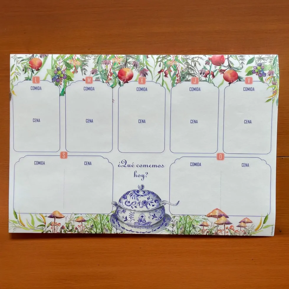 Planificador de menús semanal imantado para poder colocarlo en la nevera. Taco de 25 hojas encoladas.