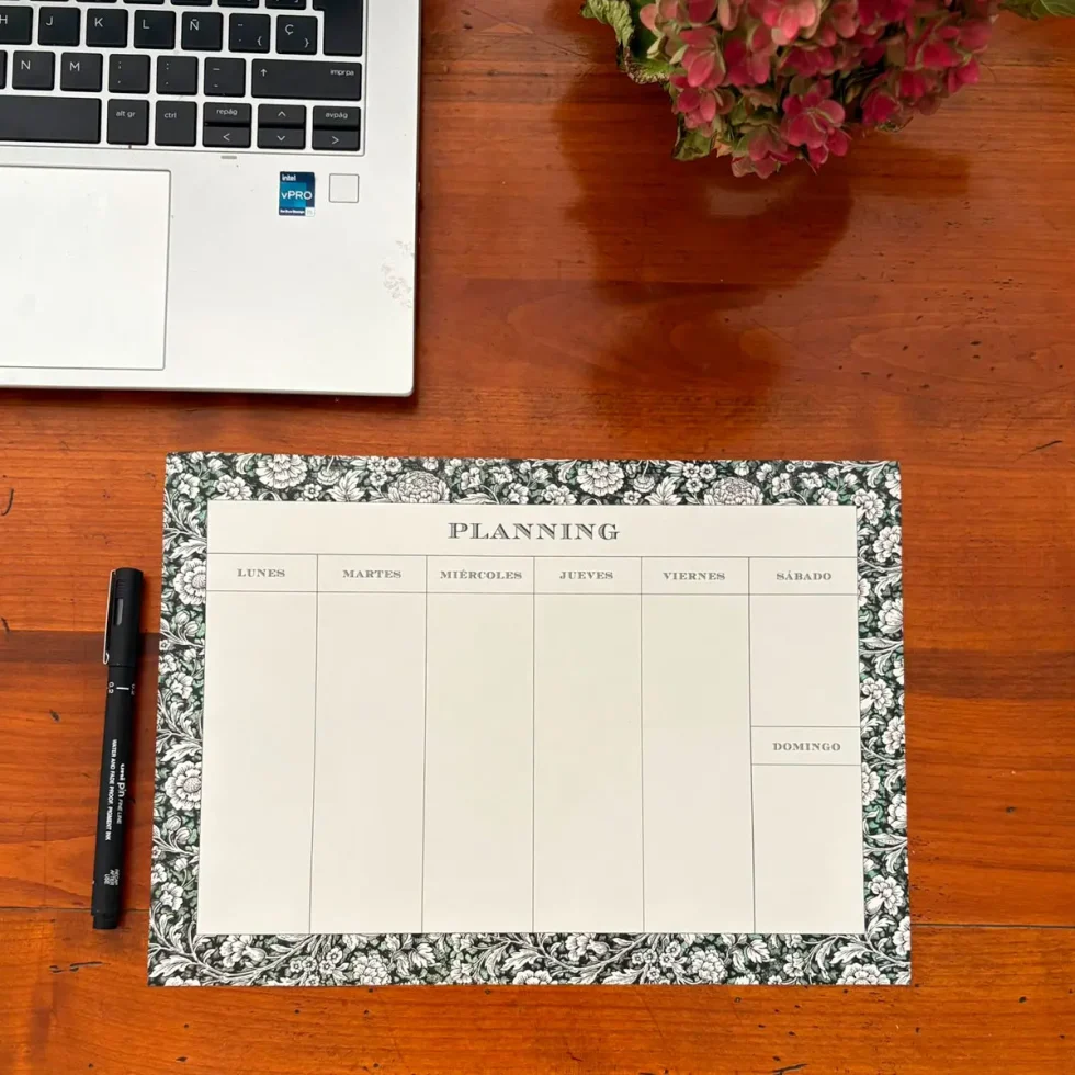 Planificador semanal estampado. Taco de 50 hojas encoladas. No incluye bolígrafo. Tamaño: A4